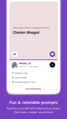 Founded by avid readers who wanted to create a platform where book lovers can connect and find love, book buddies or friendship based on their shared passion for literature, Bookmark is filled with fun prompts on books and life. Besides, there's a kickass face detect AI that prevents face photographs in prompts. Experience how love is truly blind in this brand new take on the dating app world. To many of our users, Bookmark is like a one-on-one Goodreads, where one can find readers who have read and loved or hated the same books as you.