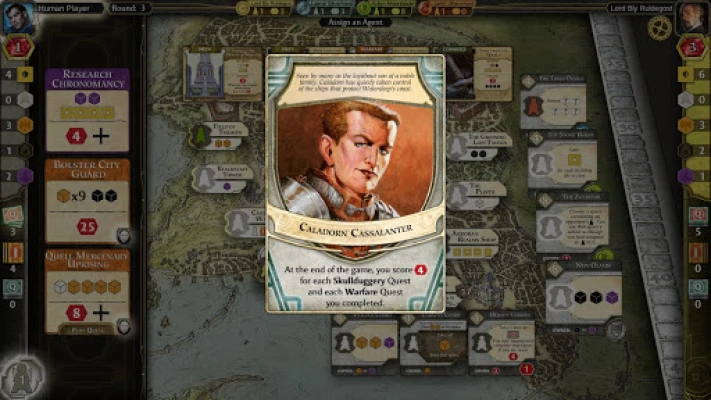 Lords of Waterdeep is a turn-based strategy game played in 8 rounds and can be played against AI or with up to 5 human players. Players take turns assigning their agents to do their bidding, whether it is to recruit new adventurers to their tavern or purchase a new building for the city. Points and resources are gained by completing quests, playing Intrigue cards, constructing new buildings or having other players utilize the buildings you have constructed. At the end of the 8 rounds bonus points are awarded and the player with the most points at the end wins the game.