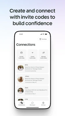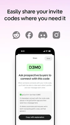 Create an invite code and ask potential buyers, sellers, renters, or landlords on Facebook, Reddit, Whatsapp, Discord and Instagram to connect. Anyone interested just needs to accept the invite by first getting verified themselves on goConfirm.